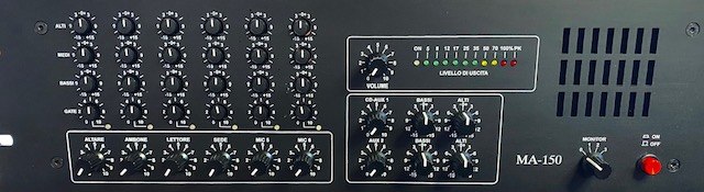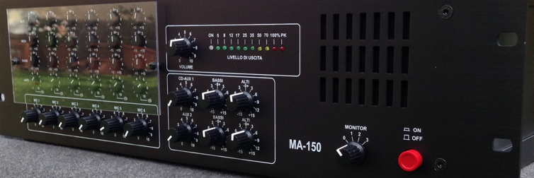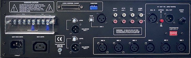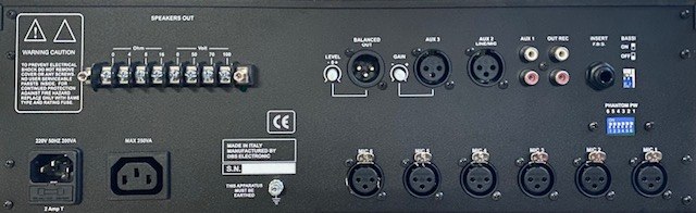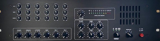 Amplificatore con 6 ingressi microfonici provvisti di alimentazione phantom, di regolazione di volume,